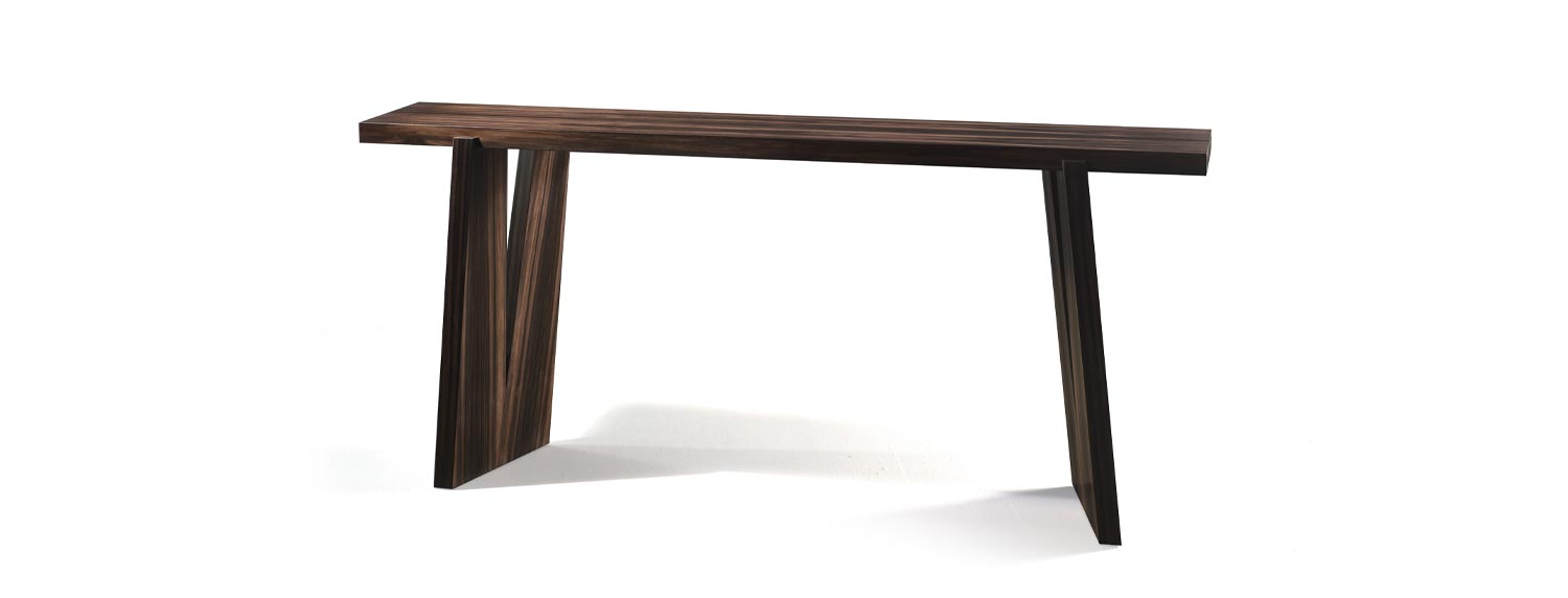 A sort of trilithon consisting of a rectangular top and two trapezoidal-shaped partitions placed side by side, the section of which surmounts the horizontal top in a refined play of joints. Made of planked wood, with a Makassar ebony veneer, the console table is an artefact solid, light and elegant: an object that seems to come from distant antiquity but feels perfectly at home in our contemporary world.