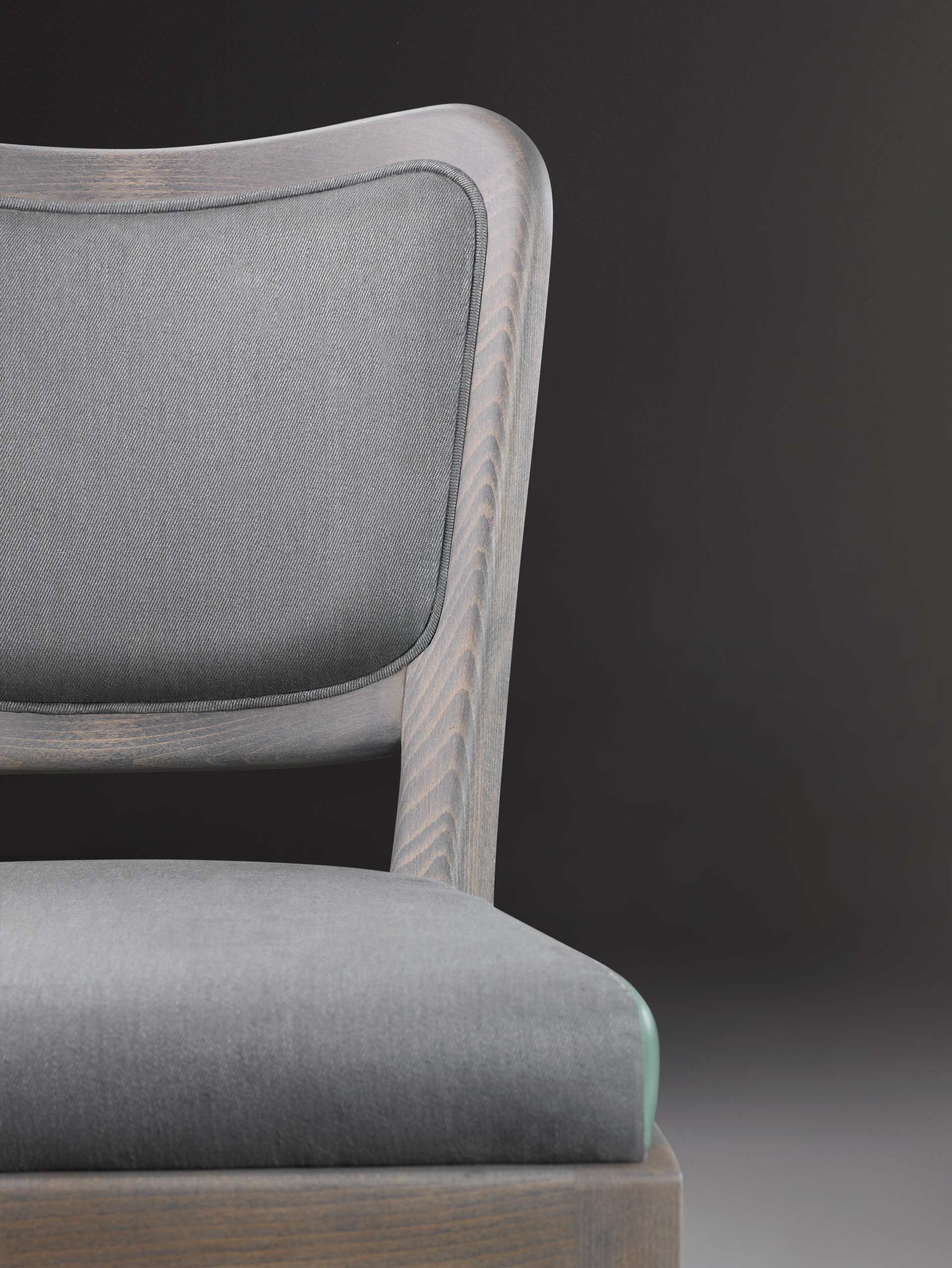 Pepita has a stained beechwood structure and a padded back. The seat is in fabric with leather details, or in leather with leather details.