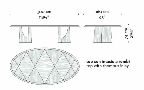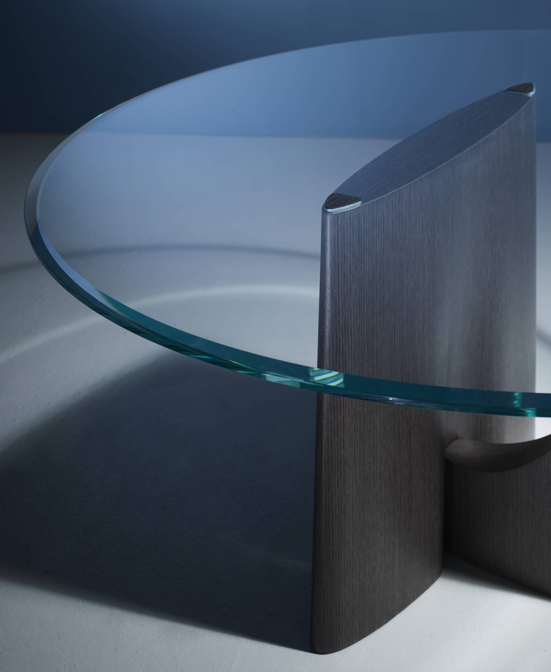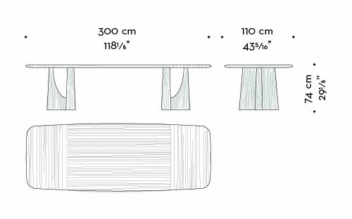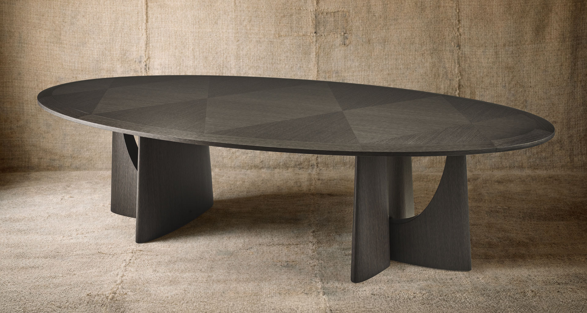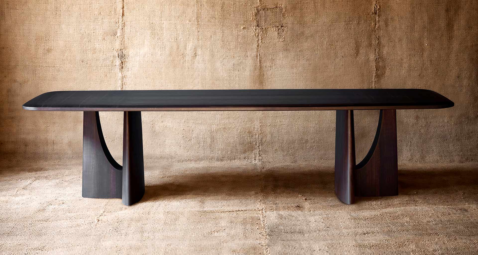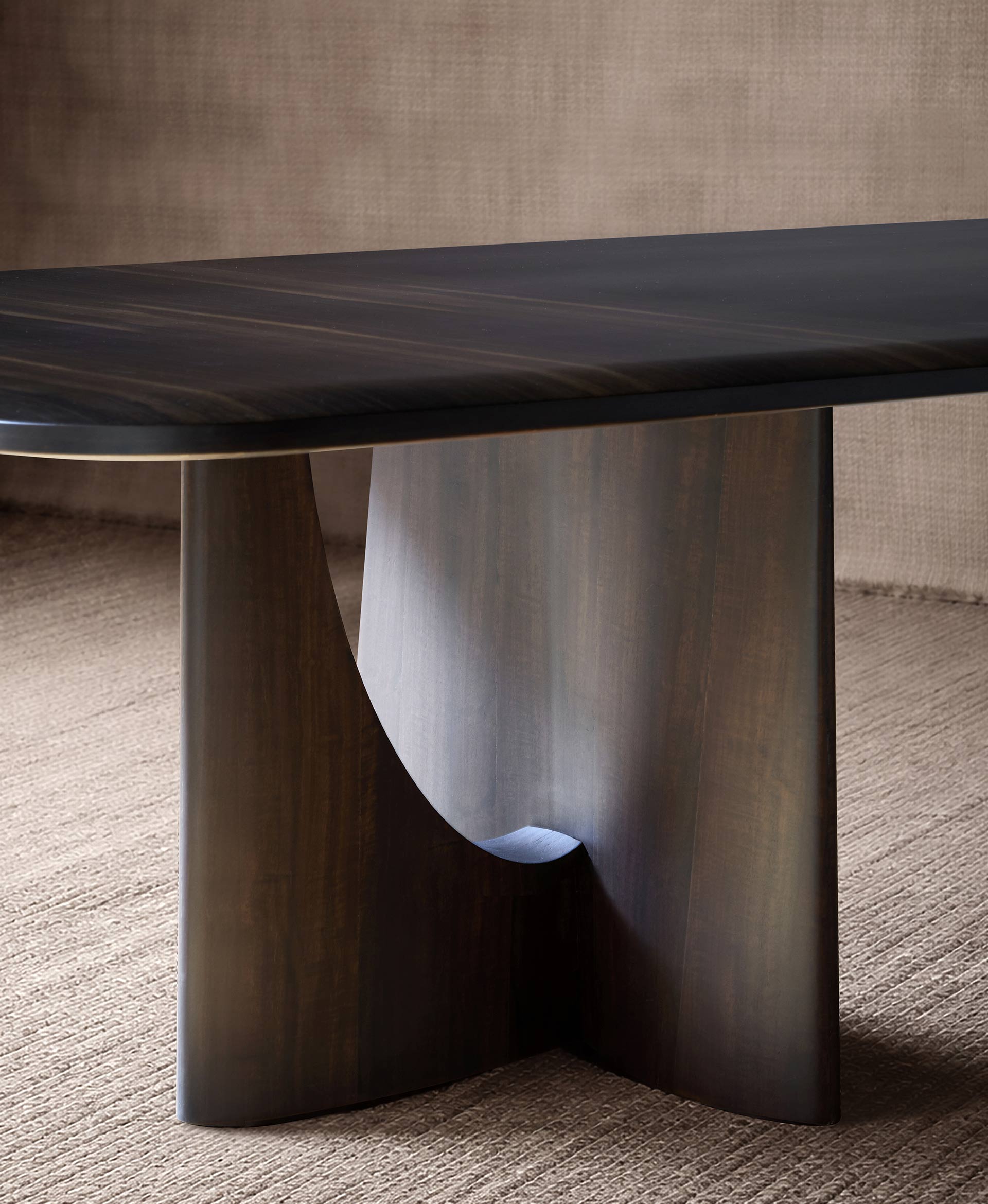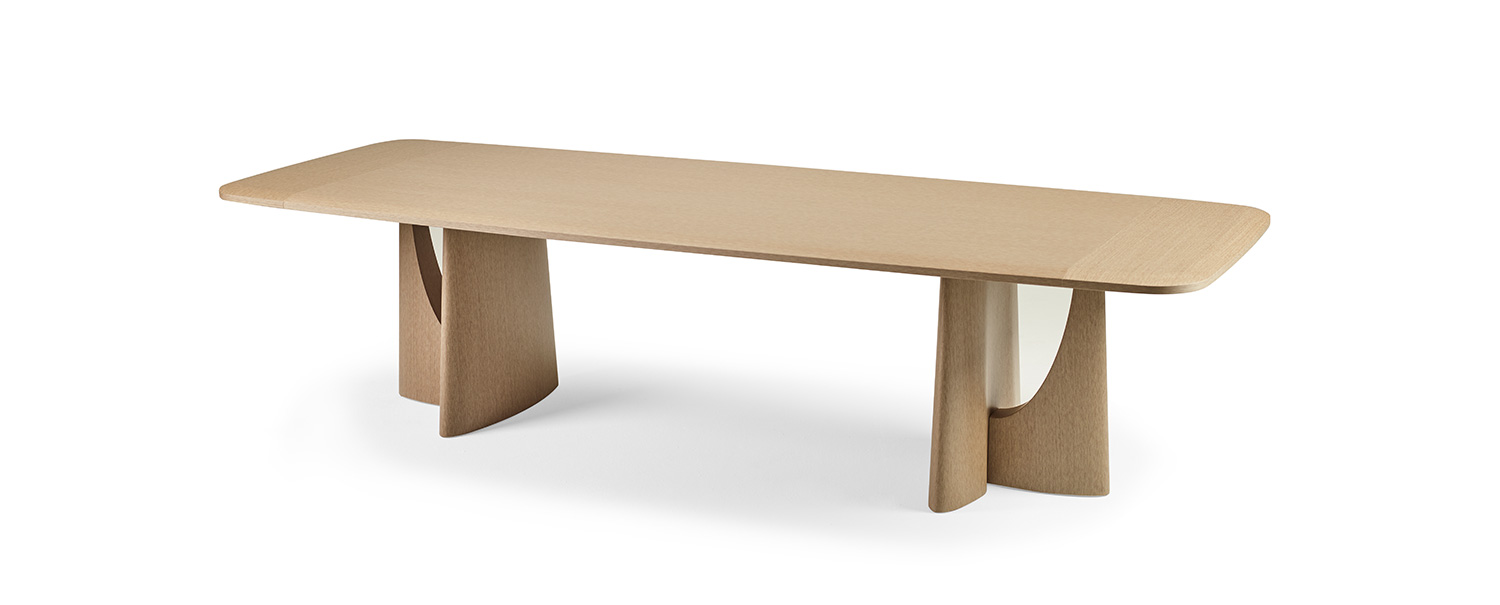 A table that makes a sculptural gesture out of material, where wood transforms into an architectural presence; intense yet restrained.