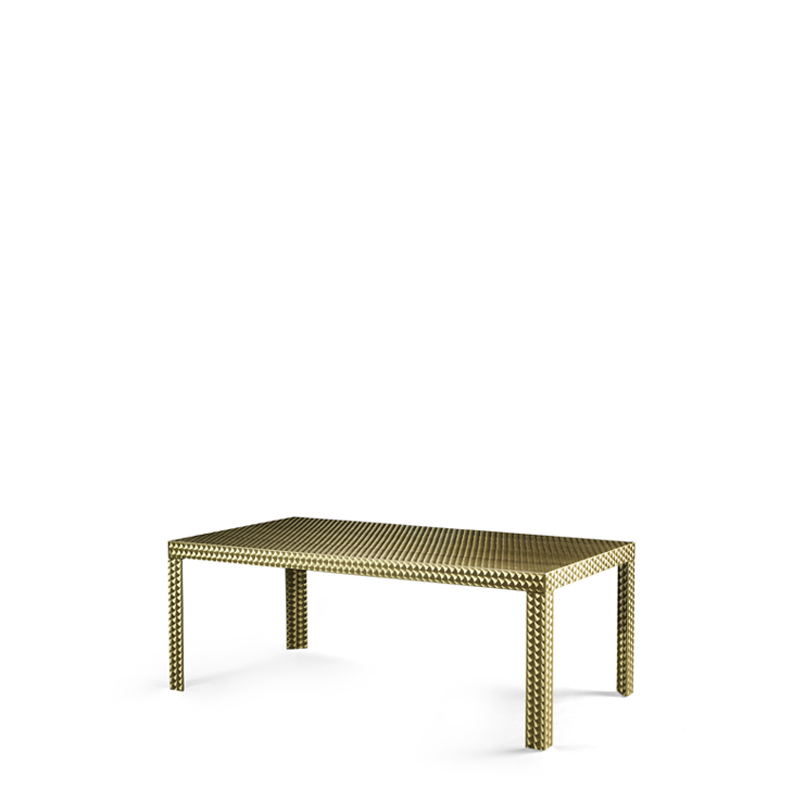 一切从置于地上的铸模开始。然后,炙热的黄铜合金就像火山岩浆般注入模具内,随后,根据冷却和大气条件的变化,金属会凝固。因此,每次都塑造出不同、独特,且无法复制的形态。可以说,初始模具是标准的,制作是批量的,但每件成品却是独一无二的。几近可以称之为炼金术杰作。