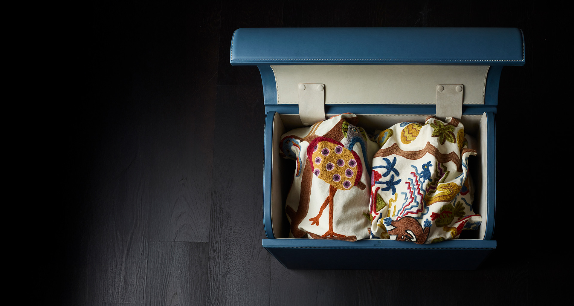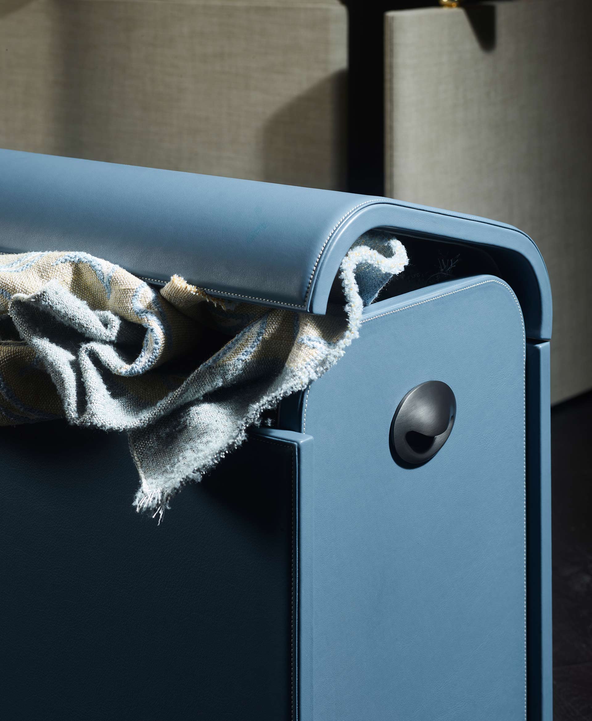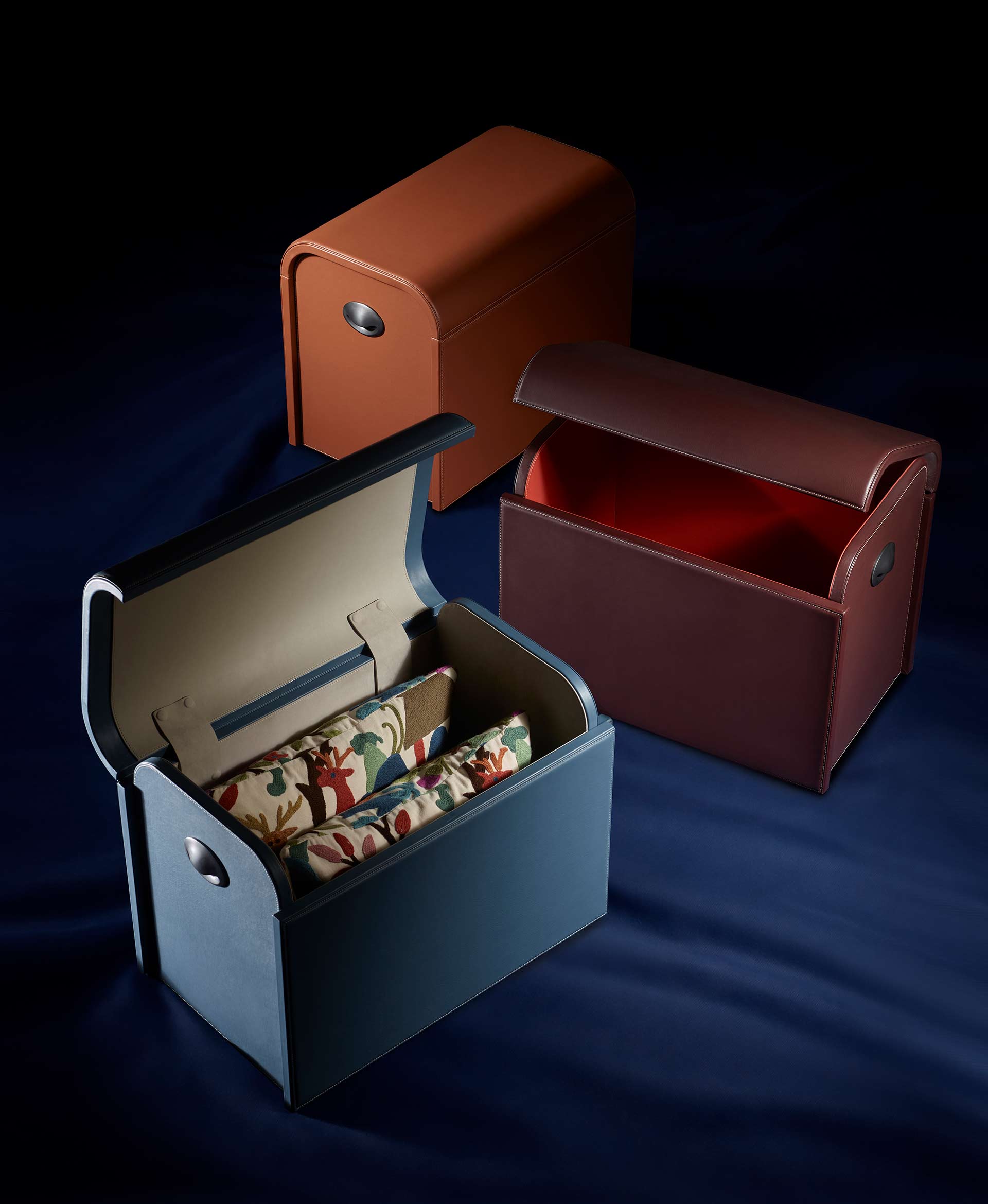 A light reference to the past, reinterpreted through a contemporary lens. The chest returns as a familiar object, yet takes on a new elegance defined by clean lines and precious materials. Fully upholstered in leather, it reveals an unexpected dialogue between interior and exterior, where different colours and finishes interact and gradually unfold.