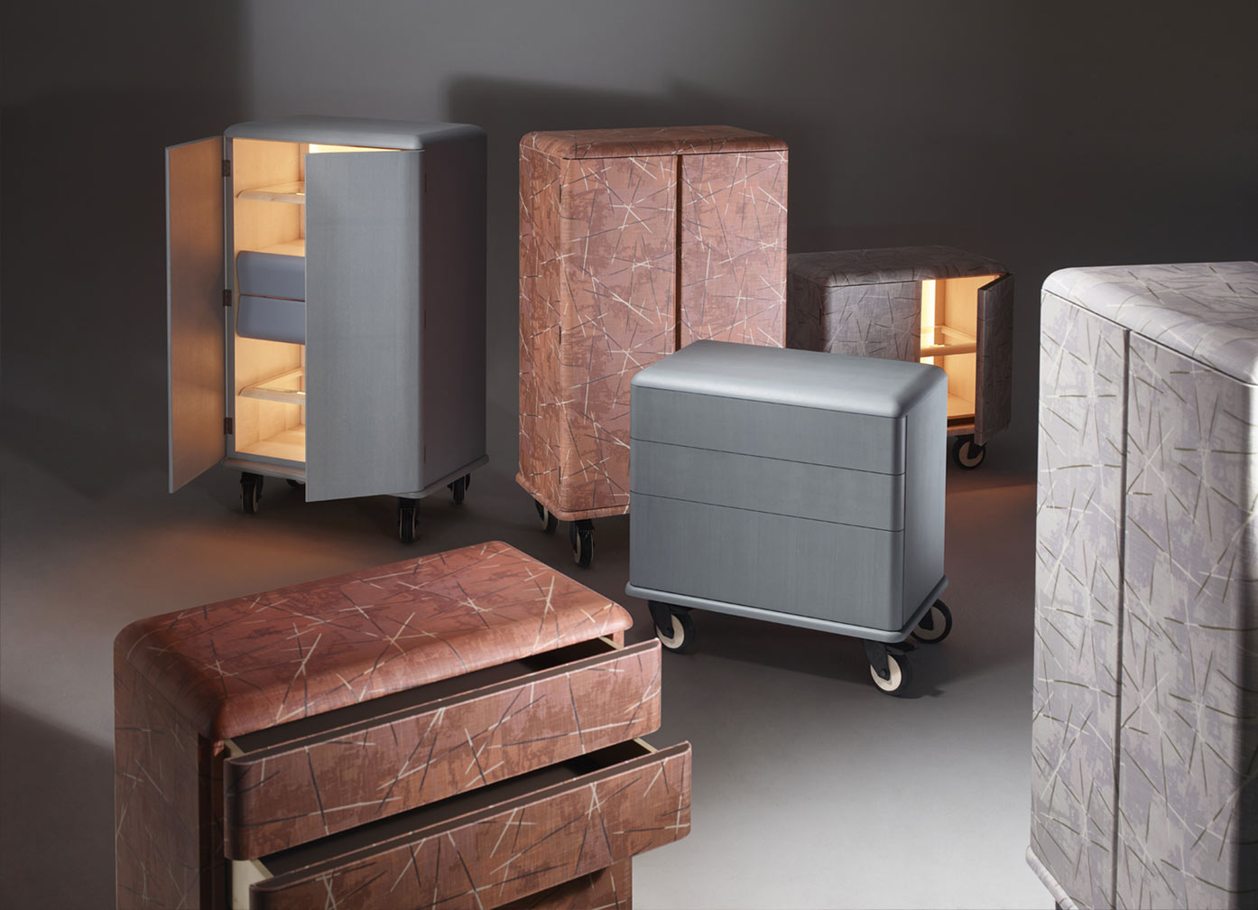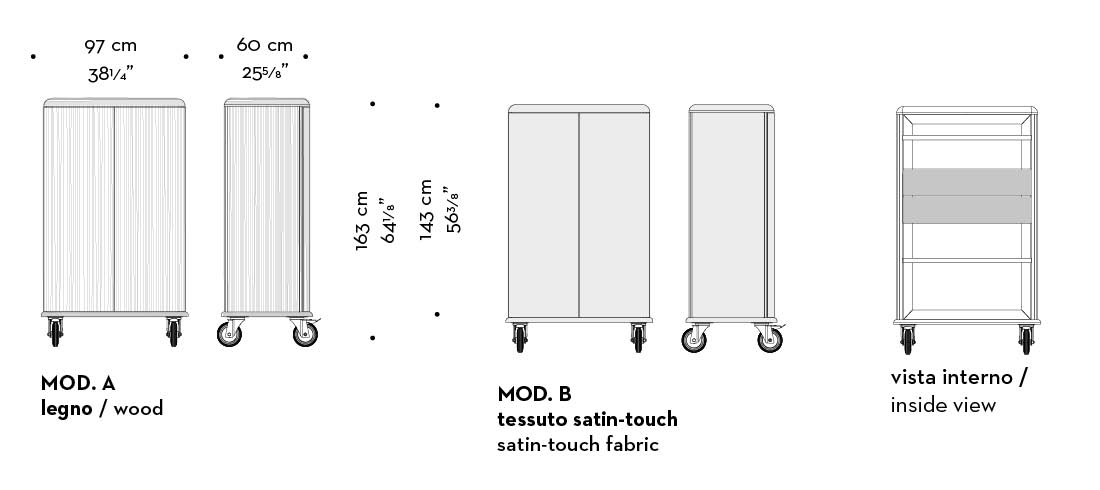 Grand Tour is upholstered in fabric, with rounded corners and harmonious forms that lend softness and visual continuity. Elegant, playful, and light in motion, Grand Tour brings order and a touch of personality to every corner of the home.