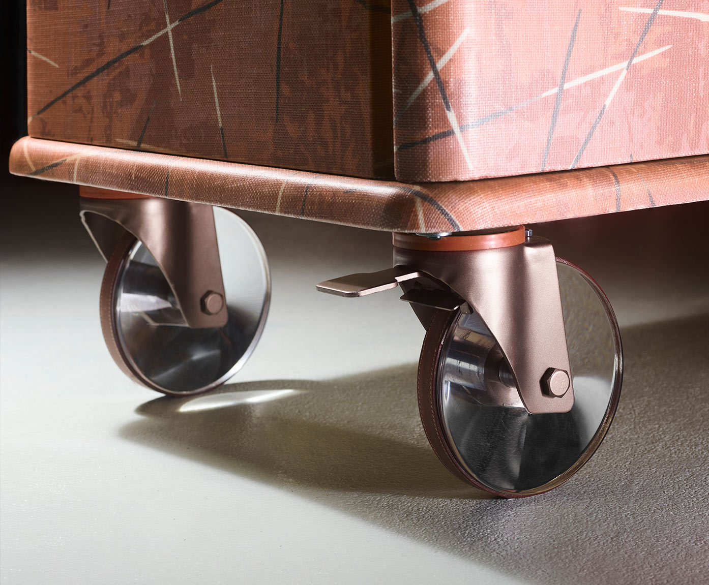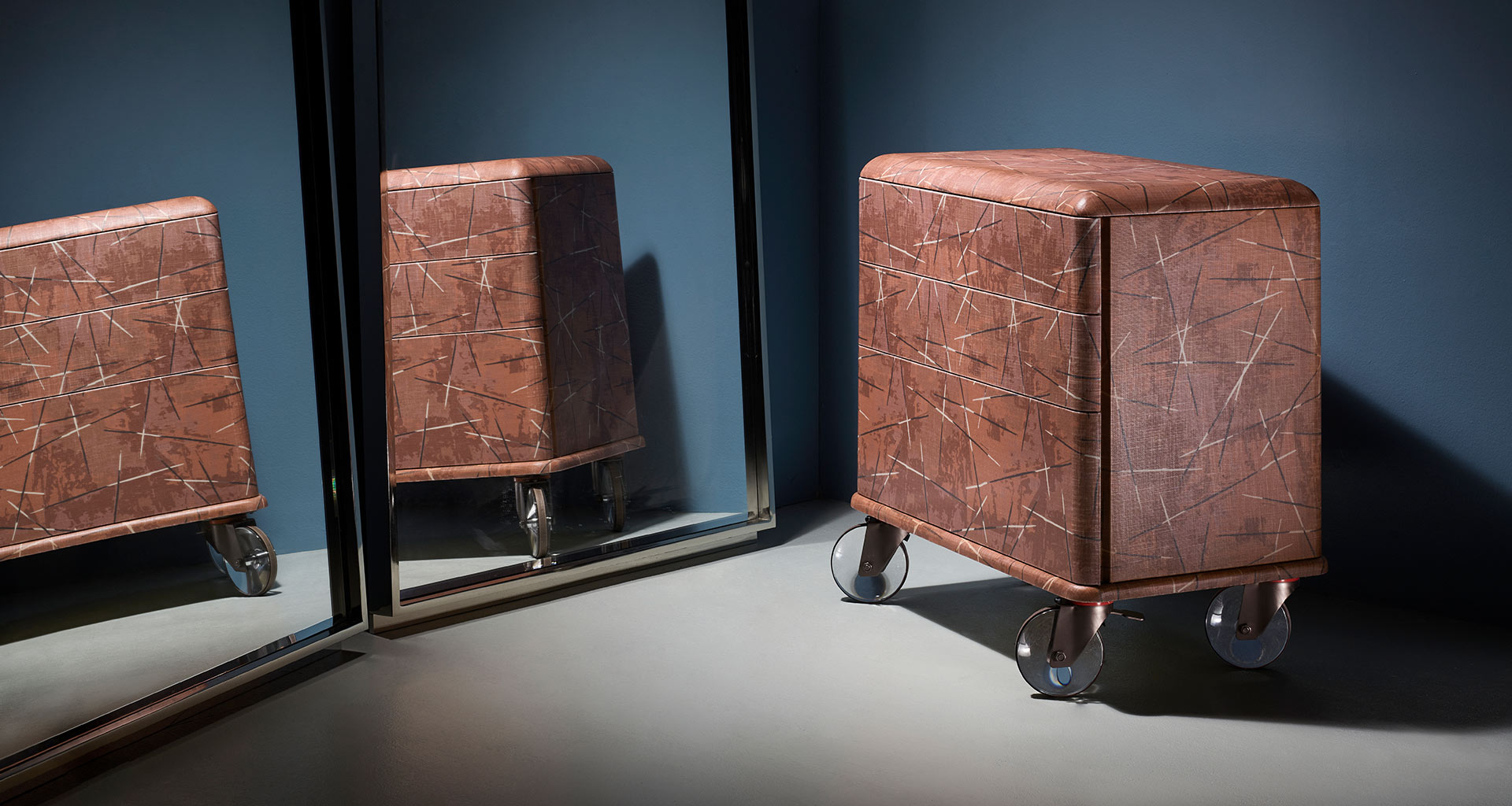 Inspired by the idea of travel, Grand Tour reflects the freedom of movement that defines both the chest of drawers and the cabinet. Equipped with practical wheels, both pieces can move effortlessly through the space, turning each shift into a small journey to be experienced within the home.