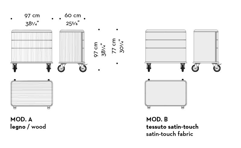 Grand Tour is upholstered in fabric, with rounded corners and harmonious forms that lend softness and visual continuity. Elegant, playful, and light in motion, Grand Tour brings order and a touch of personality to every corner of the home.