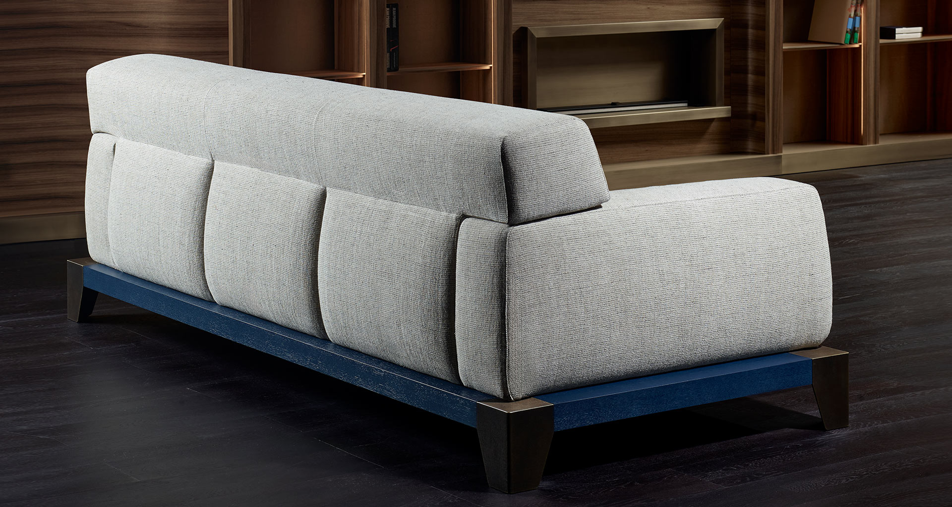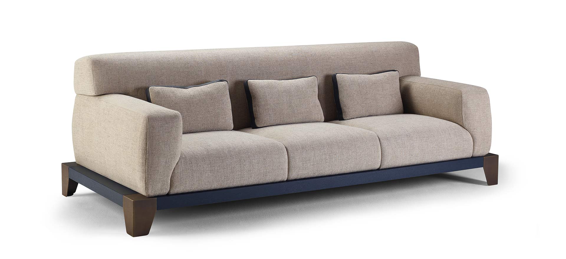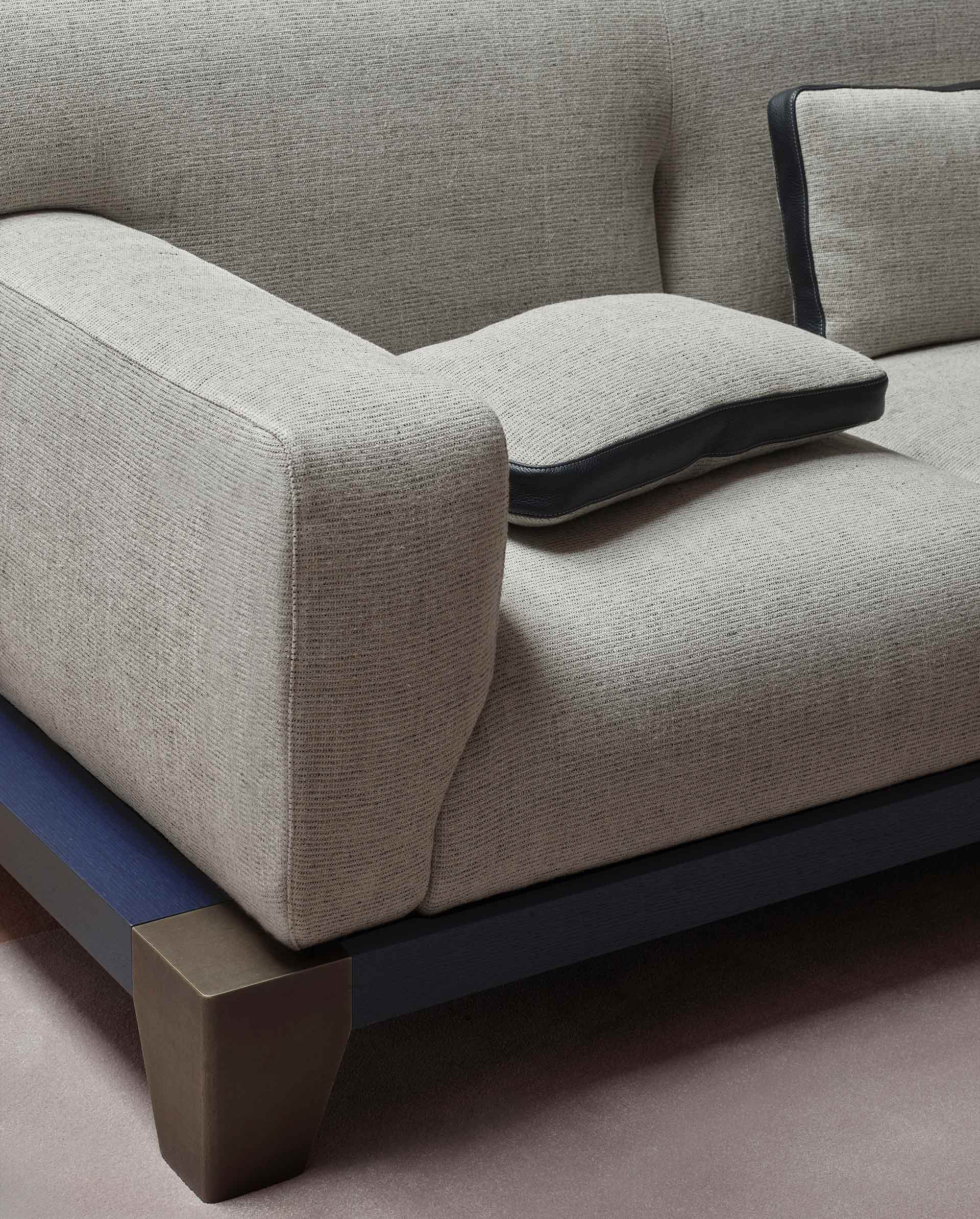 The seat, upholstered in fine fabric, is enhanced by a striking base where wooden elements blend with tactile bronze details, creating a sculptural effect. Laren is part of a family of pieces that also includes a coffee table and a daybed.