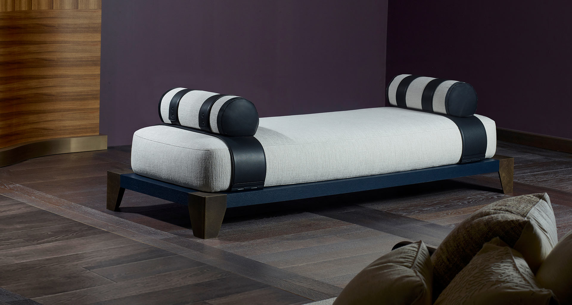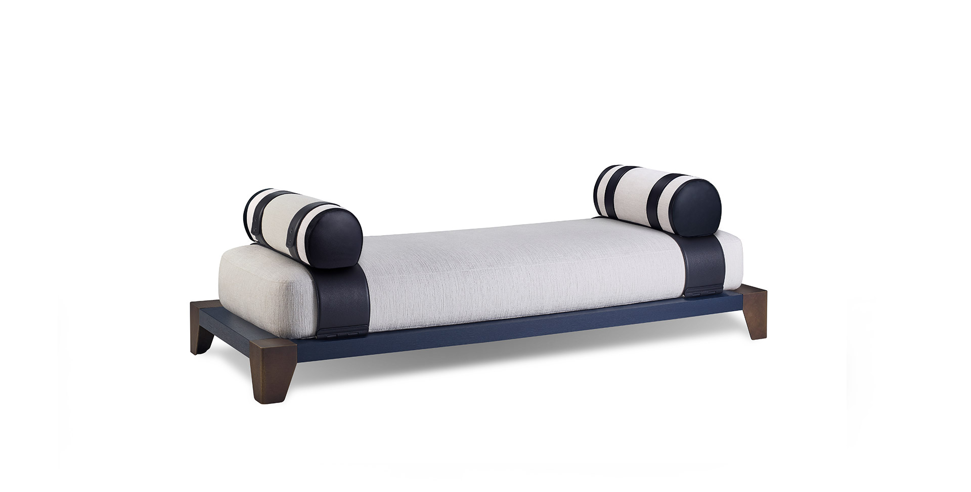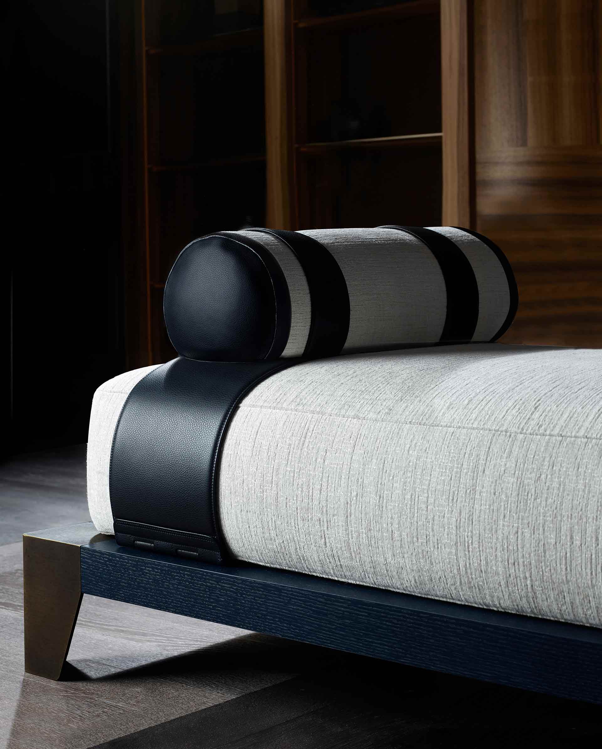 The Laren family, created in collaboration with Studio Marcel Wolterinck, is completed by the daybed, defined by the soft volumes of its cushions and enriched with elegant leather details.