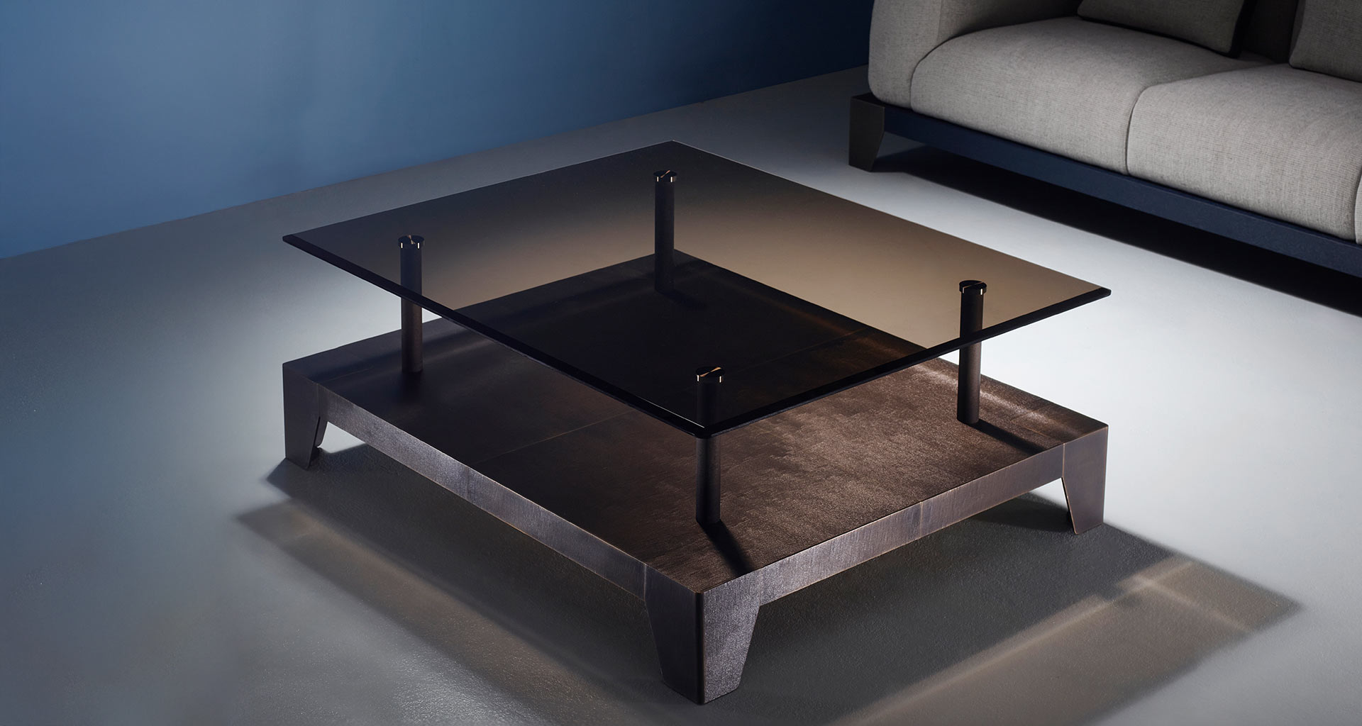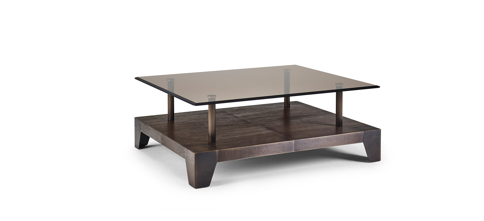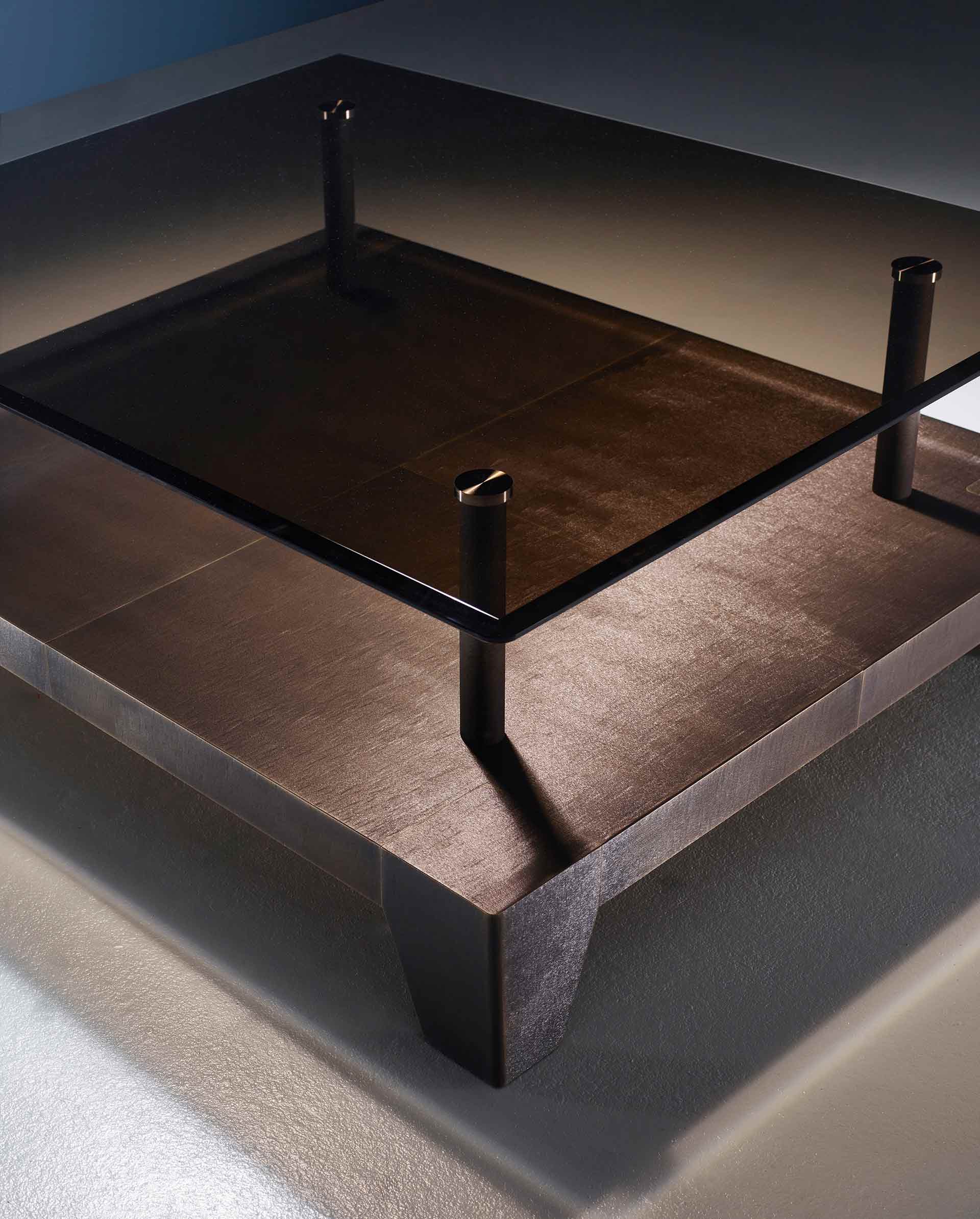 The Laren coffee table, created in collaboration with the Dutch studio Marcel Wolterinck, combines clean lines with the refined detailing typical of Promemoria. A transparent glass top rests above a wooden base, whose edges are enhanced with elegant grooves, while bronze elements complete the composition, forming sculptural supporting legs. The result is a fluid balance of sensitivity and material richness, evoking the atmosphere of Dutch Golden Age painting.