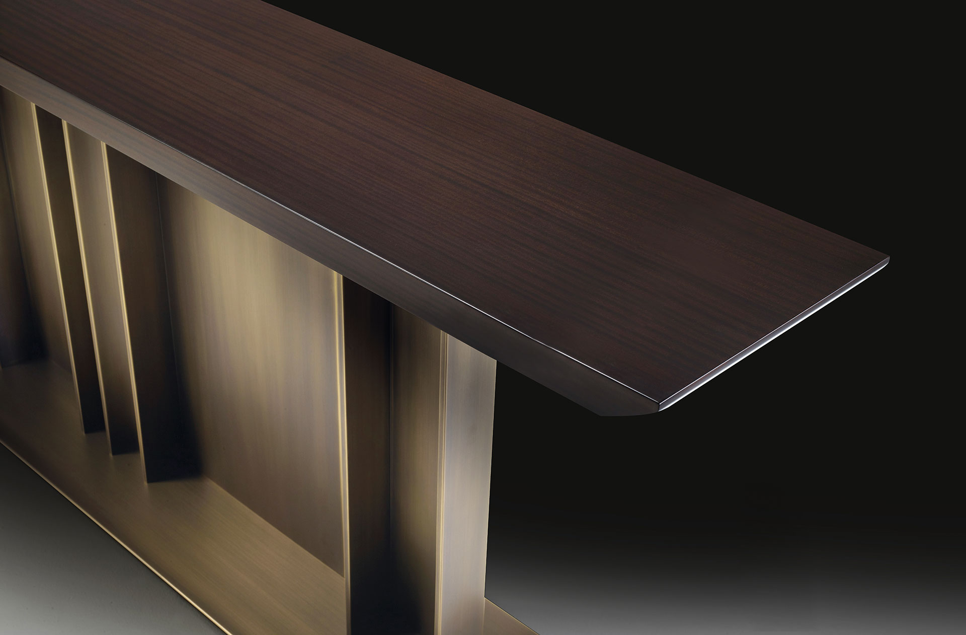 The console, with its important dimensions, is lightened by the mix of solids and voids of its base and by the shine of bronze.