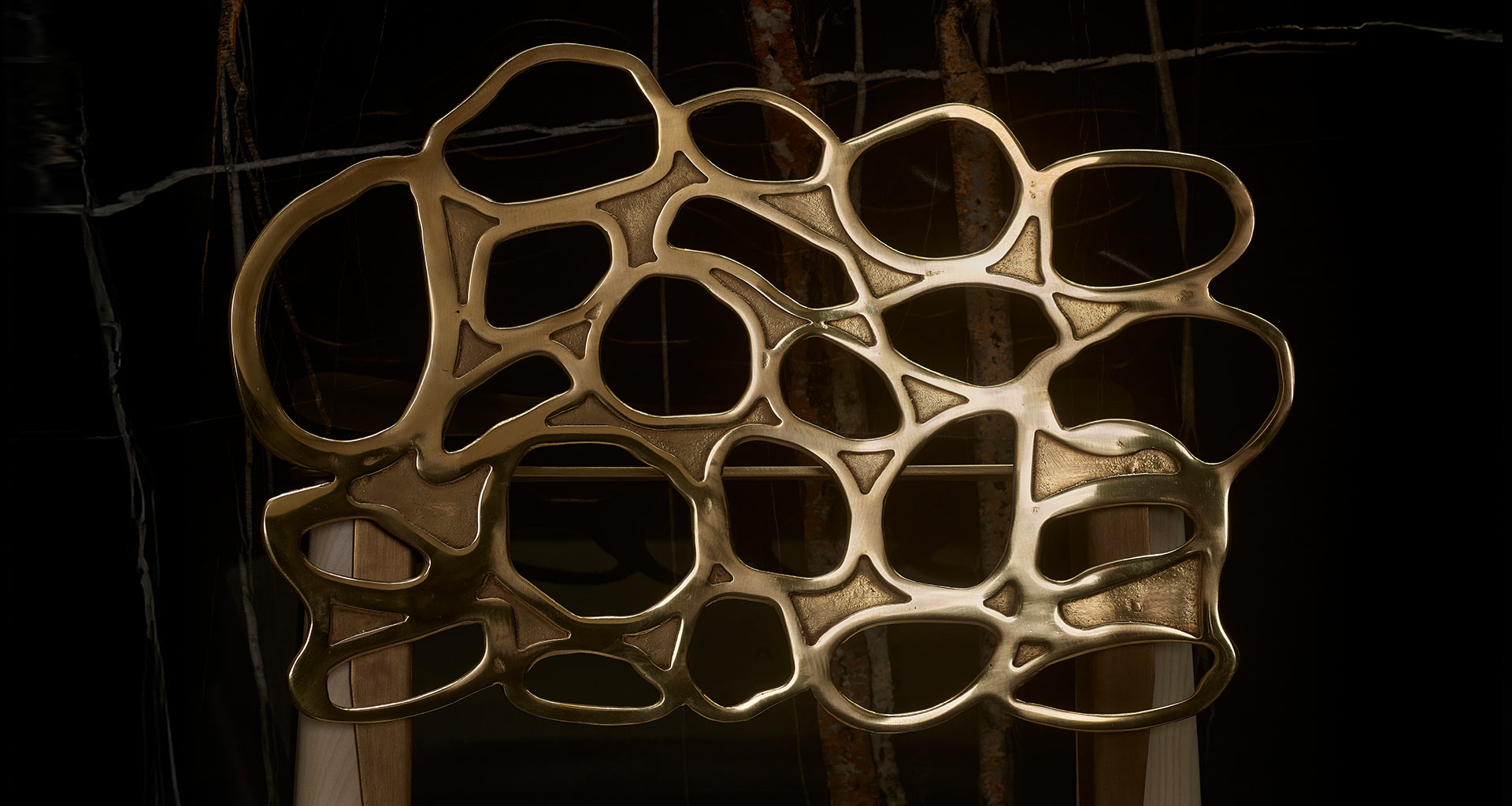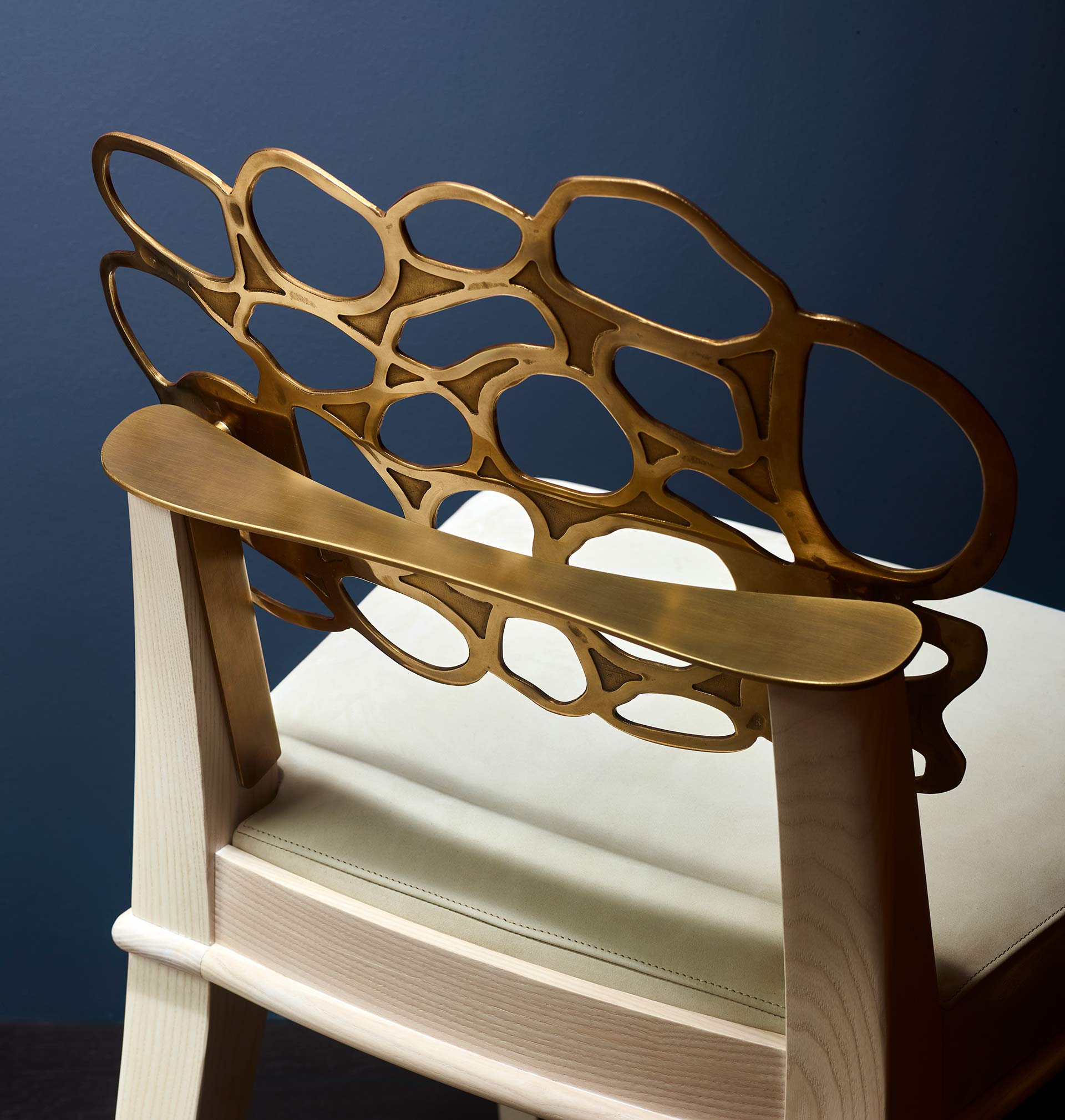 The cast bronze, shaped into an organic shape, recalls corals and quiet sea life, natural structures formed and preserved over time.